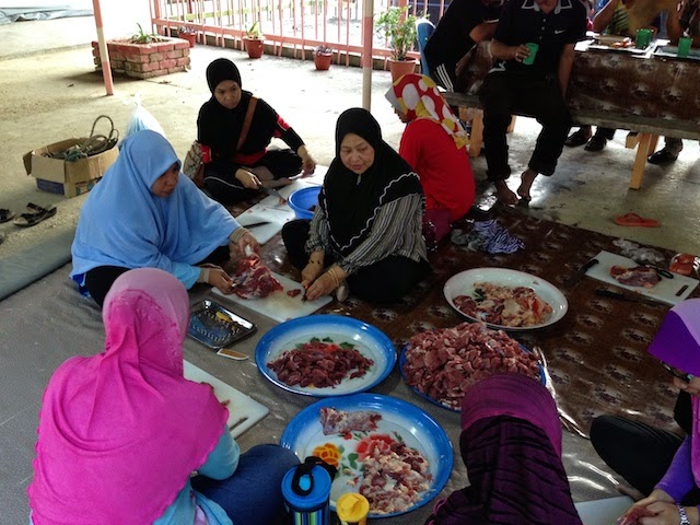 Pn. Pengetua Pn. Hj. Normah Hj. Husin bersama- sama guru-guru memotong daging lembu untuk masakan. Menu Daging Masak Ros oleh Chef Cikgu Rusdi dan rakan-rakan.